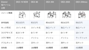 DonnerのDED-200MAXは、アコースティックドラムに近い叩き心地を再現しているため、エントリーモデルDED-70やDED-80に比べサイズが大きくなる。
